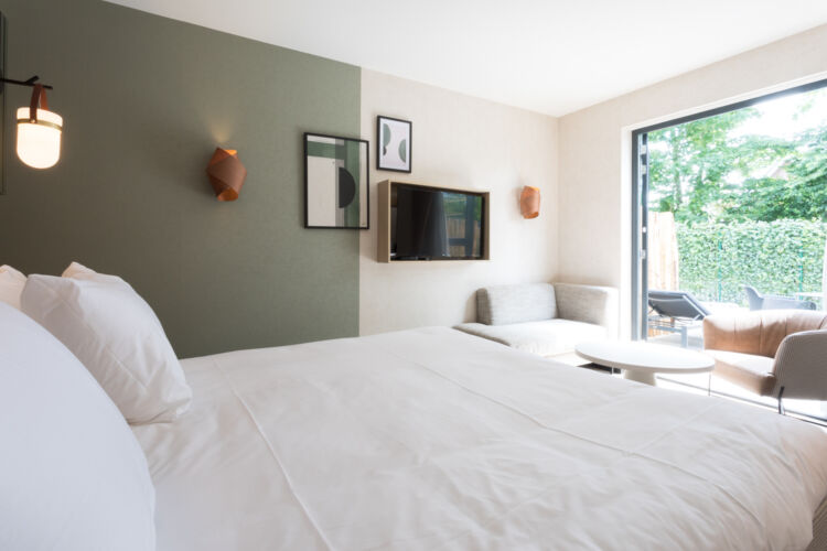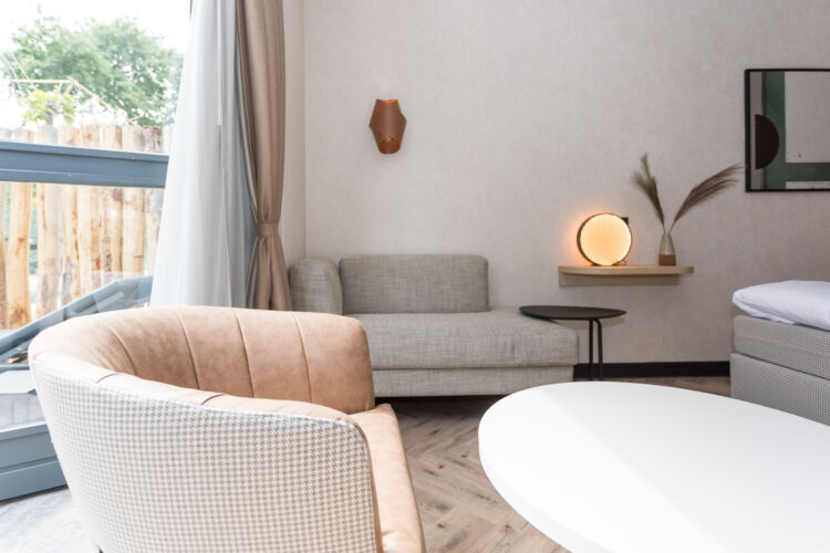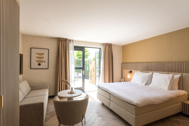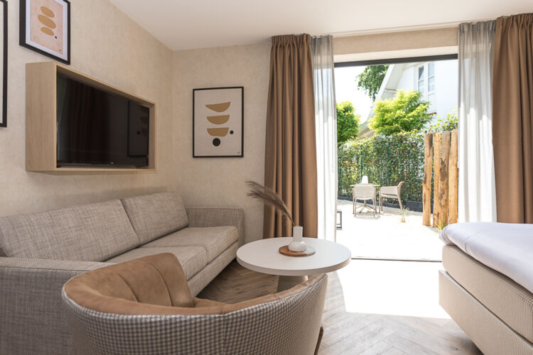 In einer Garden View Suite (26-30m2) können Sie sich vollkommen entspannen. Die Suiten mit Gartenblick befinden sich auf der Gartenseite im Erdgeschoss und im ersten Stock des Hotels und verfügen über eine Terrasse oder einen Balkon. Auf diese Weise können Sie die Sonne genießen.