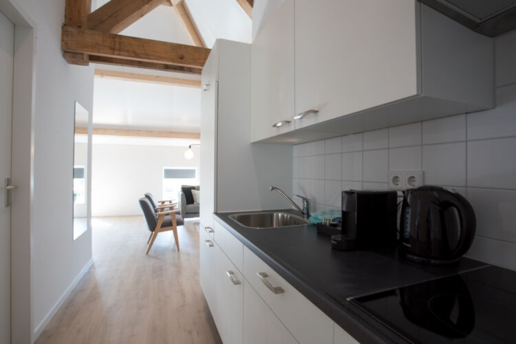 Das Wohnzimmer besteht aus einer voll ausgestatteten Sitzecke mit TV und einem Essbereich. Das geräumige Badezimmer verfügt über ein waschbecken und eine begehbare Dusche. Die Küche ist mit einem Induktionskochfeld, Geschirrspüler, Kaffeemaschine, Wasserkocher, Kühlschrank und einem kompletten Satz Geschirr und Küchengeräten ausgestattet. Die Terrasse befindet sich im Erdgeschoss und ist über einen privaten Eingang erreichbar.