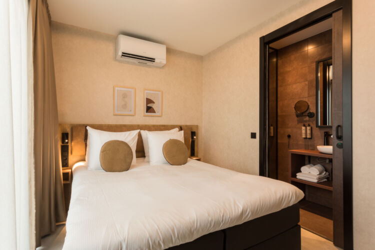 Der Cube hat zwei Ebenen. Der Schlafbereich (13 m²) ist mit einem großzügigen Boxspringbett, einem luxuriösen Badezimmer mit Regendusche und Toilette, einem Flachbildschirm (Smart-TV), Kaffee- und Teezubereitungsmöglichkeiten, einem kleinen Kühlschrank, einer Klimaanlage und einem Safe ausgestattet. Über die Treppe erreichen Sie die einzigartige überdachte Dachterrasse (14m²) mit stilvoller Lounge.