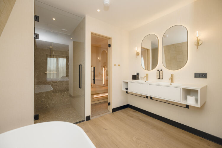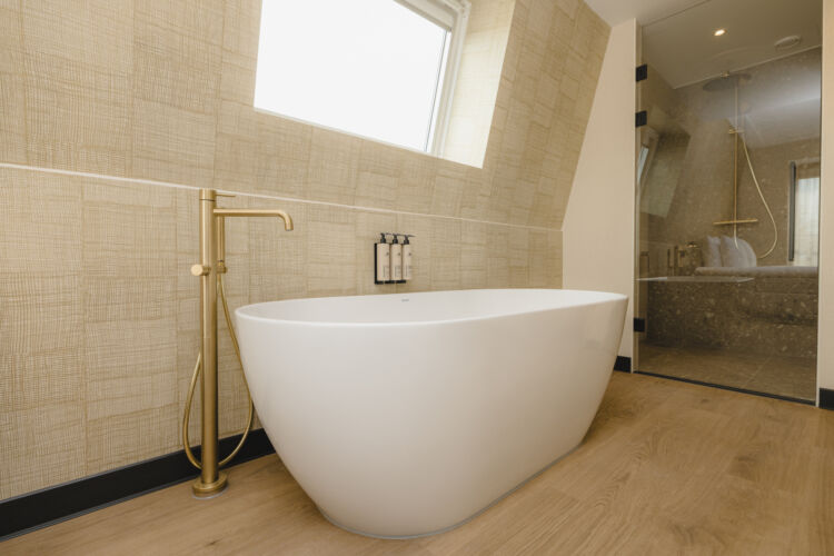 Tauchen Sie ein in den Luxus der Wellness Suite (45-50 m2). Mit eigener Infrarotsauna und freistehender Badewanne zum Entspannen und Auftanken. Nach einer Nacht in dieser Suite werden Sie sich wie neu geboren fühlen. Das geräumige, stilvolle Wohnzimmer verleiht Ihrem Aufenthalt den letzten Schliff.