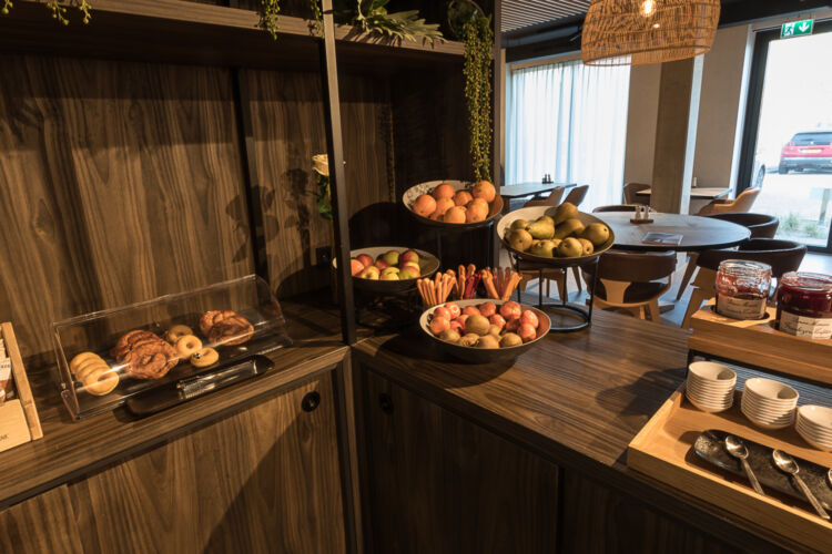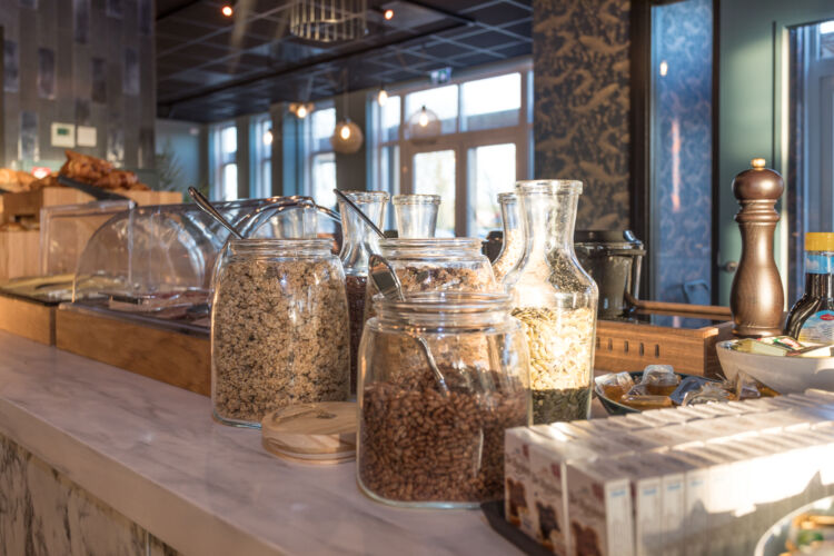 Op ons ontbijtbuffet gebruiken we zo min mogelijk monoverpakkingen. Liever gebruiken we grotere verpakkingen waarvan de gast zelf de gewenste hoeveelheid kan pakken. Zo produceren we minder afval. Van ontbijtkoeken, crackers, beschuit tot de kaas- en vleeswaren: we kopen dit allemaal als grootverpakking in. De uitzondering hierop is de boter voor op brood, deze is om hygienische redenen wel per stuk verpakt. Om deze keuze toch milieubewust te maken is de verpakking niet van plastic, maar van papier.