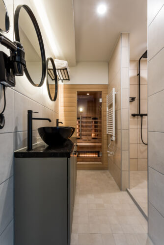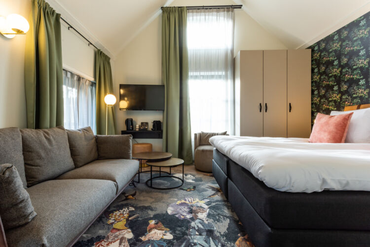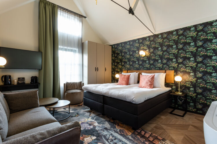 Laat u onderdompelen in alle luxe en comfort die u bij deze exceptionele suite mag verwachten. De ruime suite van 38m2 beschikt naast een badkamer met inloopdouche ook over een infrarood sauna en een bad.