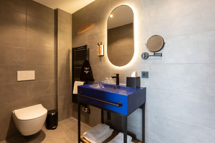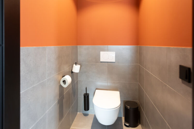 De badkamer heeft een regendouche en een toilet. Handdoeken zijn aanwezig. De kitchenette en het eetgedeelte beschikken over een gootsteen, koelkast, inductiekookplaat met afzuigkap, combi-oven, servies en kookbenodigdheden.
