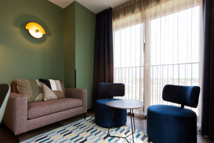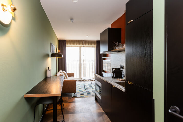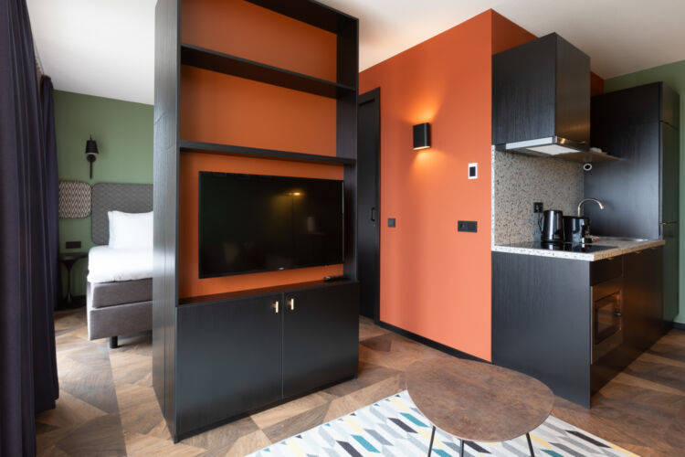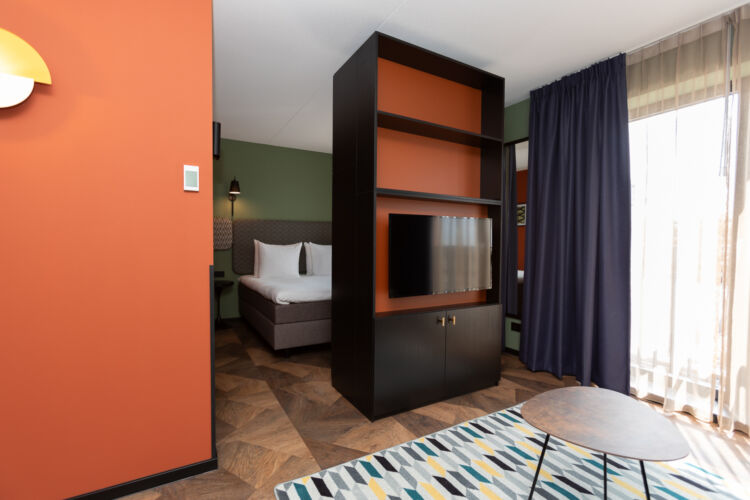 Dit appartement (41 m2) beschikt over een stijlvolle living met flatscreen televisie, airconditioning, koffie- en theefaciliteiten en een kluisje. Er is een deels afgescheiden werkruimte met een bureau. De aparte slaapkamer beschikt over een comfortabel boxspringbed, inclusief bedlinnen.